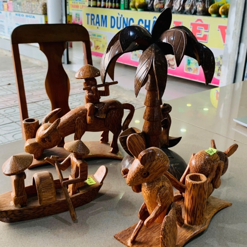 Bức ảnh chụp một bộ sưu tập các tác phẩm điêu khắc gỗ thủ công, đặt trên mặt bàn bóng loáng. Những tác phẩm này được chế tác từ gỗ dừa, mang đậm nét văn hóa dân gian Việt Nam, đặc biệt là phong cách miền Tây sông nước.